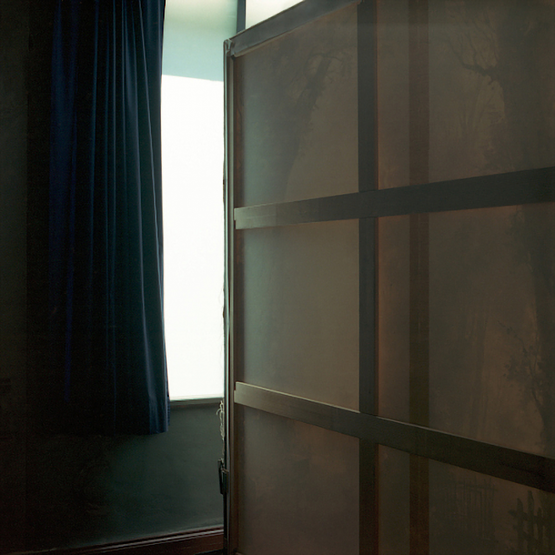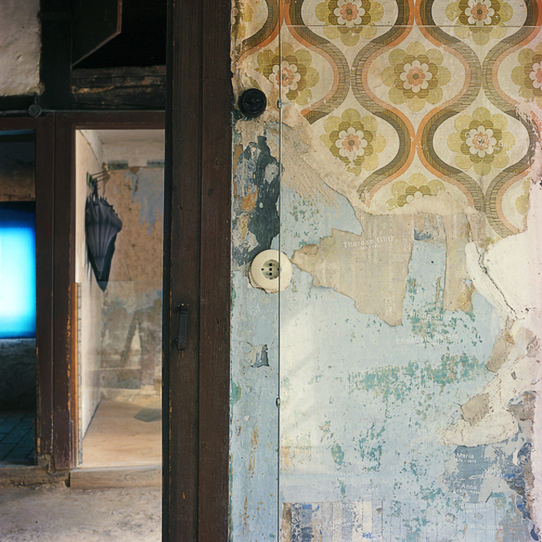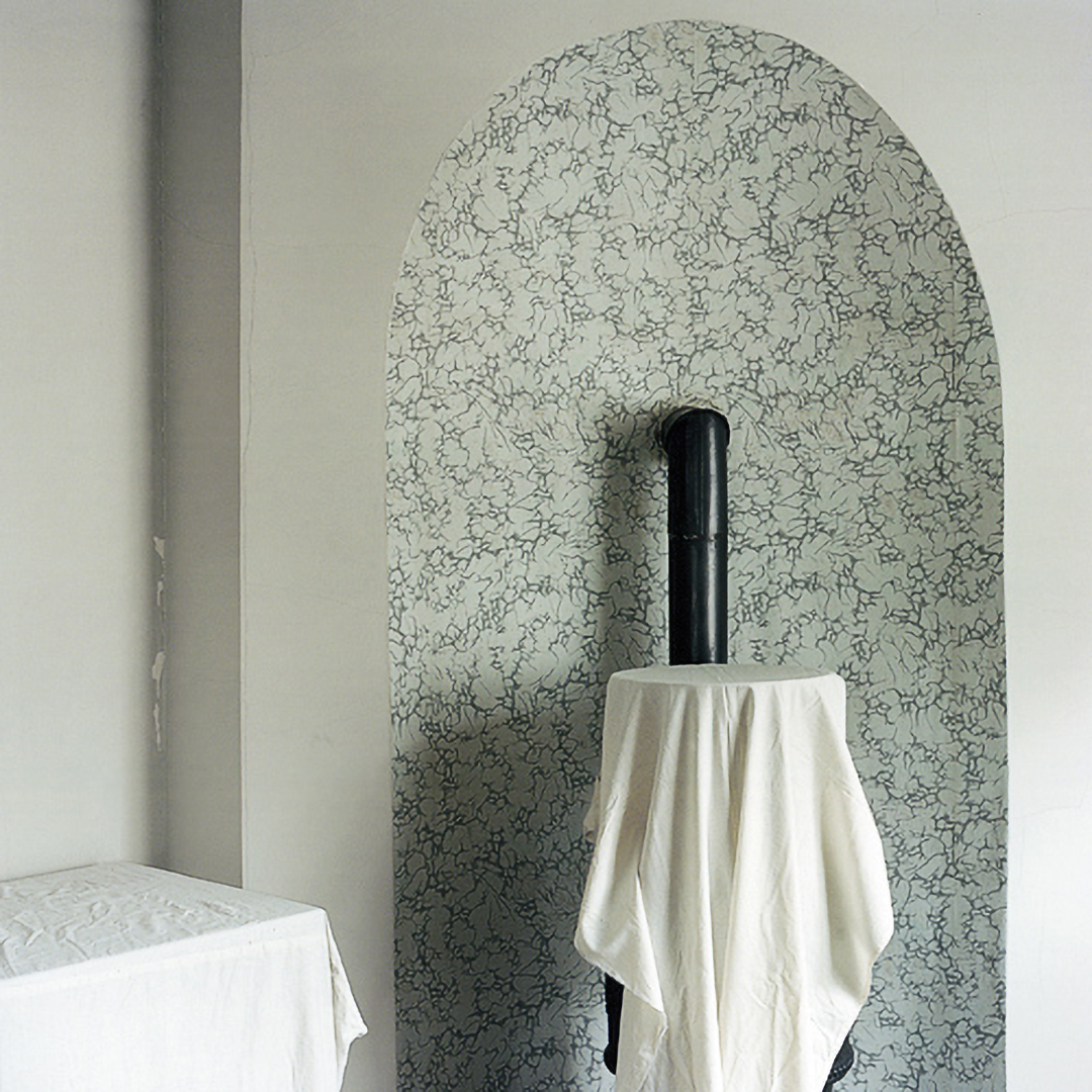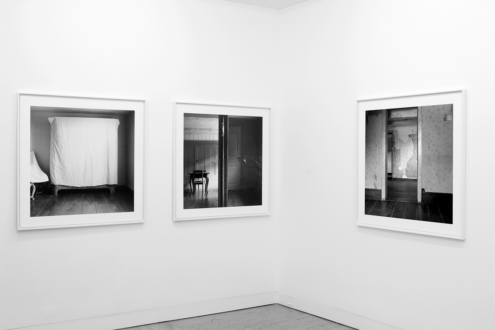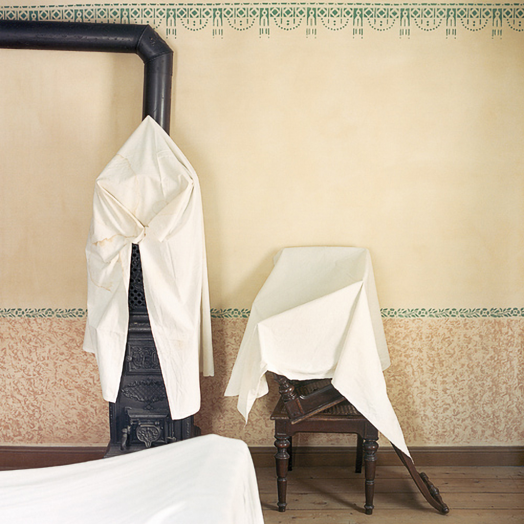The museum as an institution that generates contexts and place for the (re)presentation of history is at the center of Sarah Straßmann’s work. She developed a series of works for which she examined the open-air museum in Detmold. The photos show abandoned buildings, some of whose furniture is draped with white sheets. The soft folds of the fabrics are in dialogue with the otherwise indicated geometric structures, as they become visible in the photographs.