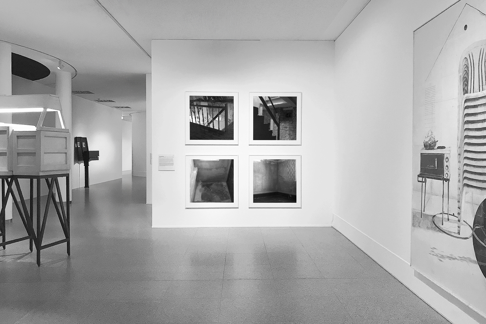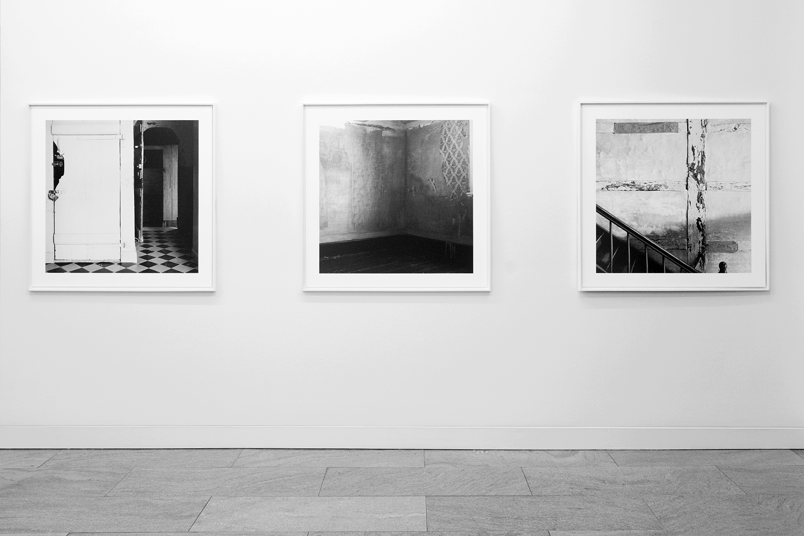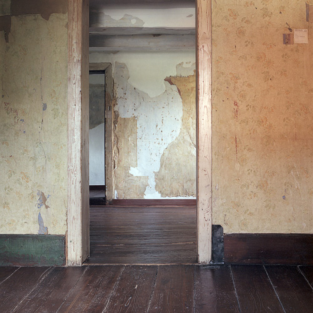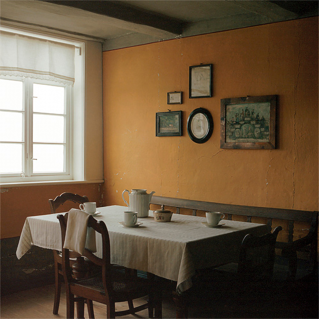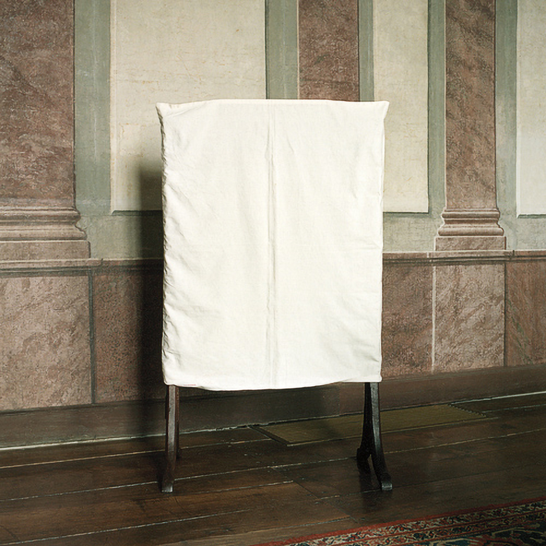 The museum as an institution that generates contexts and place for the (re)presentation of history is at the center of Sarah Straßmann’s work. She developed a series of works for which she examined the open-air museum in Detmold. The photos show abandoned buildings, some of whose furniture is draped with white sheets. The soft folds of the fabrics are in dialogue with the otherwise indicated geometric structures, as they become visible in the photographs.
